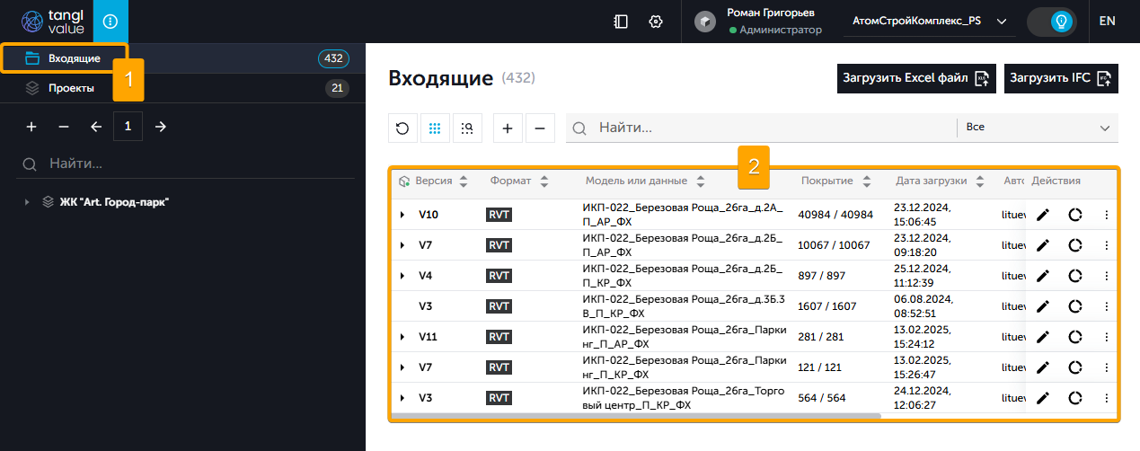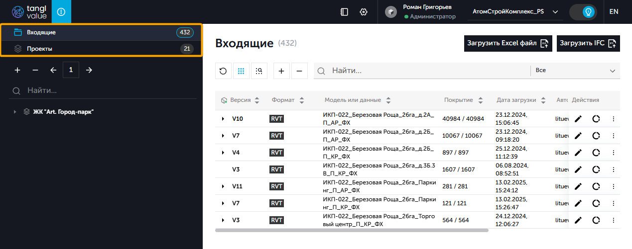 Входящие – это оригинальные 3D-модели, загруженные в Tangl. Вы можете просматривать их отдельно, объединять в жилые комплексы, просматривать свойства элементов и многое другое. Большинство моделей разработано ИКП, часть создана другими проектировщиками, но все они предназначены для Атомстройкомплекс.