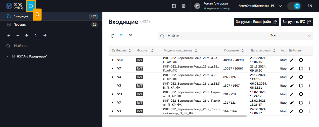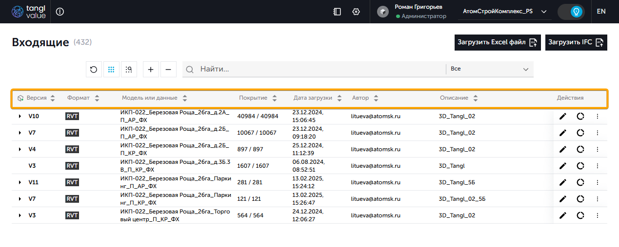 - Версия – это порядковый номер модели, загруженной в Tangl под тем же именем. Например, модель ИКП-036_Бабушкина_д.2Б_Р_КЖ1_ФХ регулярно обновляется: при каждом изменении BIM-отдел перезагружает модель, номер версии увеличивается.