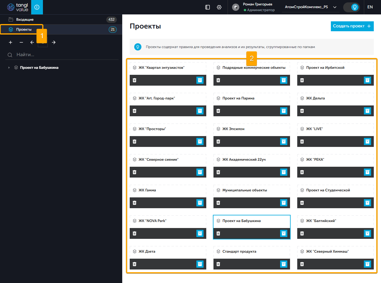 Нажмите Проекты (1), чтобы увидеть список проектов справа (2)⬇️