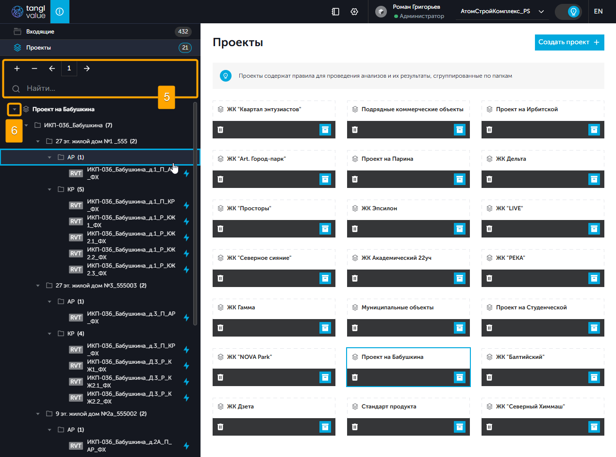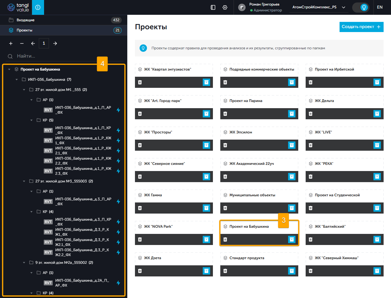 Проекты – это обработанные в результаты анализа 3D-модели, представленные в виде структуры папок. Результатами анализа могут быть ВОР, постатейные бюджеты стадии П, сметы стадии Р, данные для эксплуатации и многое другое.